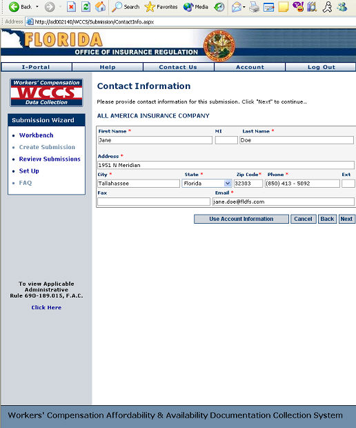 1. Enter the contact information of the main individual responsible for generating the submission by filling in the form provided on the Contact Information screen. The red asterisk (*) is placed next to fields where information is required. Fields that do not have an asterisk next to them are optional.