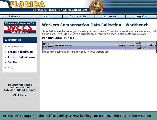 After logging on to WCCS the screen will display the WCCS Workbench; the central hub of the WCCS application. The WCCS Workbench displays any existing submissions you may be working on. Users can use the Workbench to continue working on existing submissions, or review previous submissions. From the WCCS Workbench Task Bar you can also create new submissions, review submissions, and edit insurer contact information. Note: First time users of WCCS will not see any data populating the Pending Submissions table. First time users should refer to the next two sections to begin filing data. |
