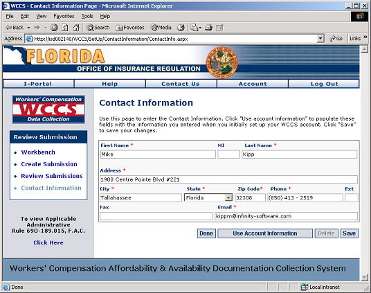 1. Enter the contact information of the main individual responsible for generating the submission by filling in the form provided on the Contact Information screen. The red asterisk (*) is placed next to fields where information is required. Fields that do not have an asterisk next to them are optional.