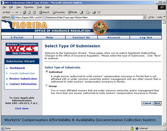 The Submission Wizard will guide you step-by-step through creating a new submission. The Submission Wizard allows you to submit data and review the data before submitting it to the Office of Insurance Regulation. |