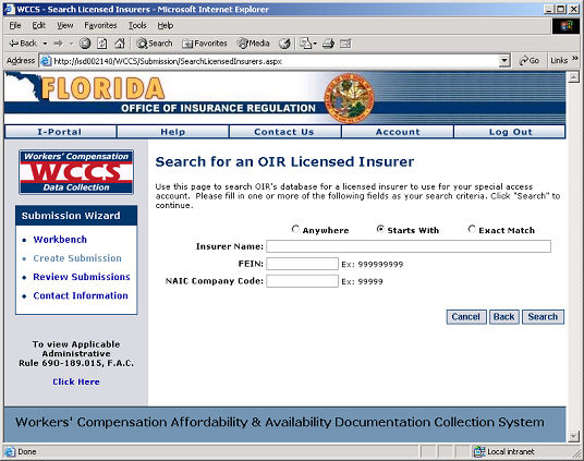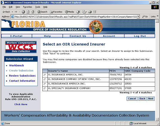 Select an OIR licensed insurer by clicking the radio button next to the name of the appropriate insurer.
